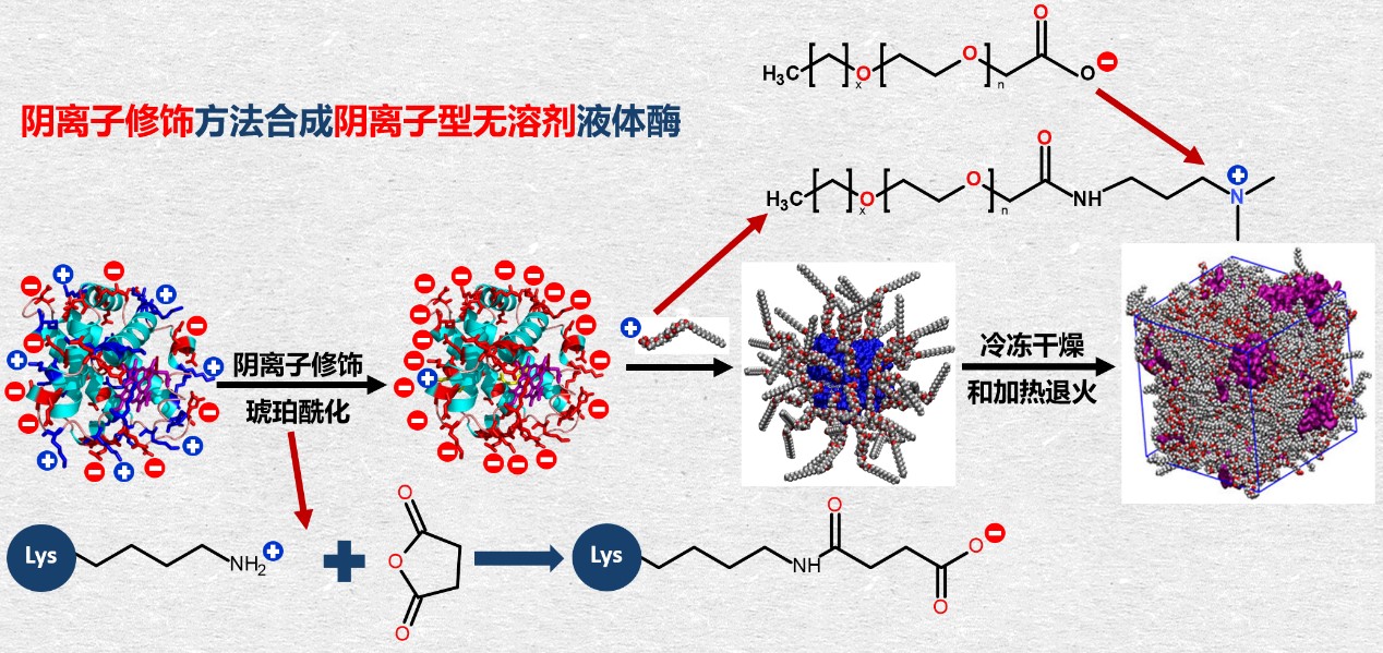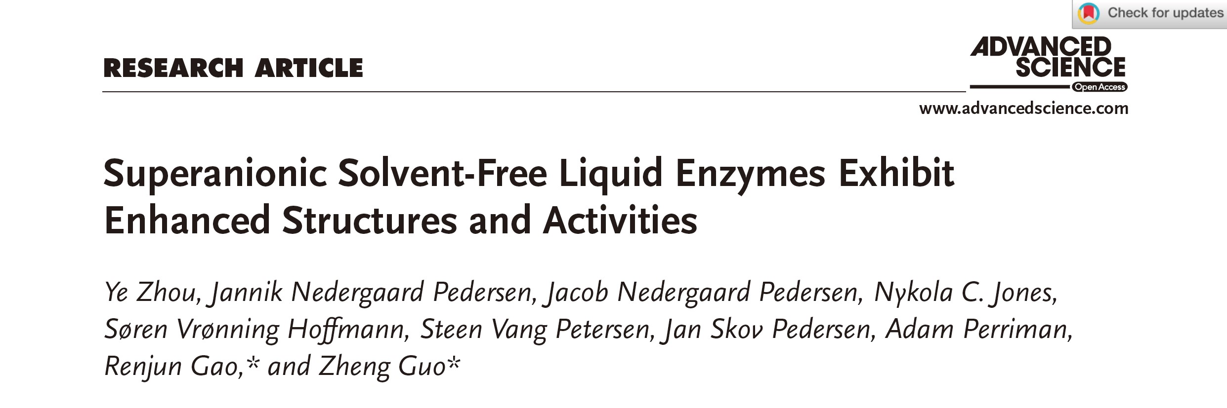 分子酶学工程教育部重点实验室高仁钧教授团队与丹麦奥胡斯大学郭诤教授团队合作,提出了新型无溶剂液体蛋白(酶)的设计策略。将枯草杆菌脂肪酶LipA先离子化修饰,再与离子聚合物交联,成功合成液体酶,使常温酶具备了超嗜热酶的催化特性,该成果在生物催化中颇有应用潜力。相关研究内容已于近日以题为"Superanionic Solvent-Free Liquid Enzymes Exhibit Enhanced Structures and Activities”发表于Advanced. Science. (2022, 2202359). //doi.org/10.1002/advs.202202359